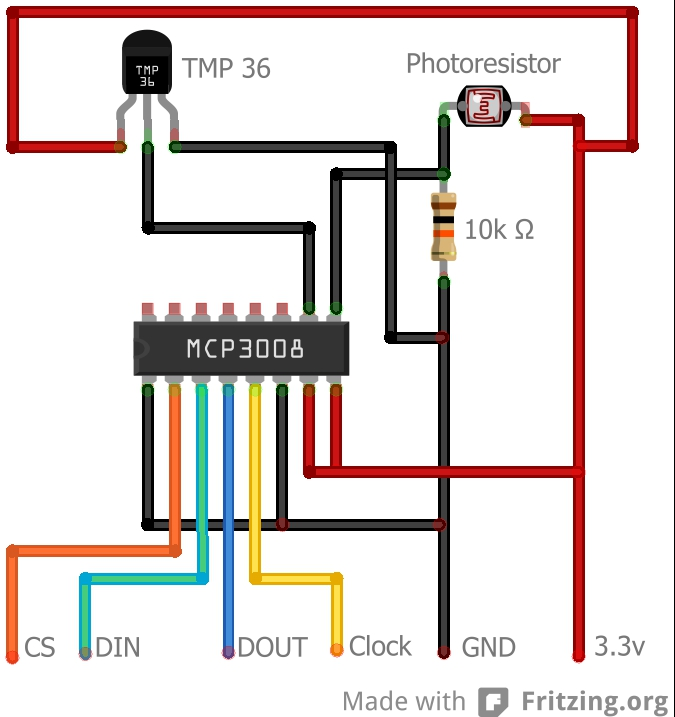 I am using the MCP3008 to read the temperature and the amount of light using a photo-resistor; the circuit looks like the following: