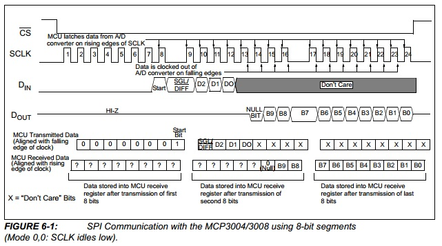 Hence to read the value of a pin on the MCP3008, using the previously mentioned procedures and communication diagram, we do the following: