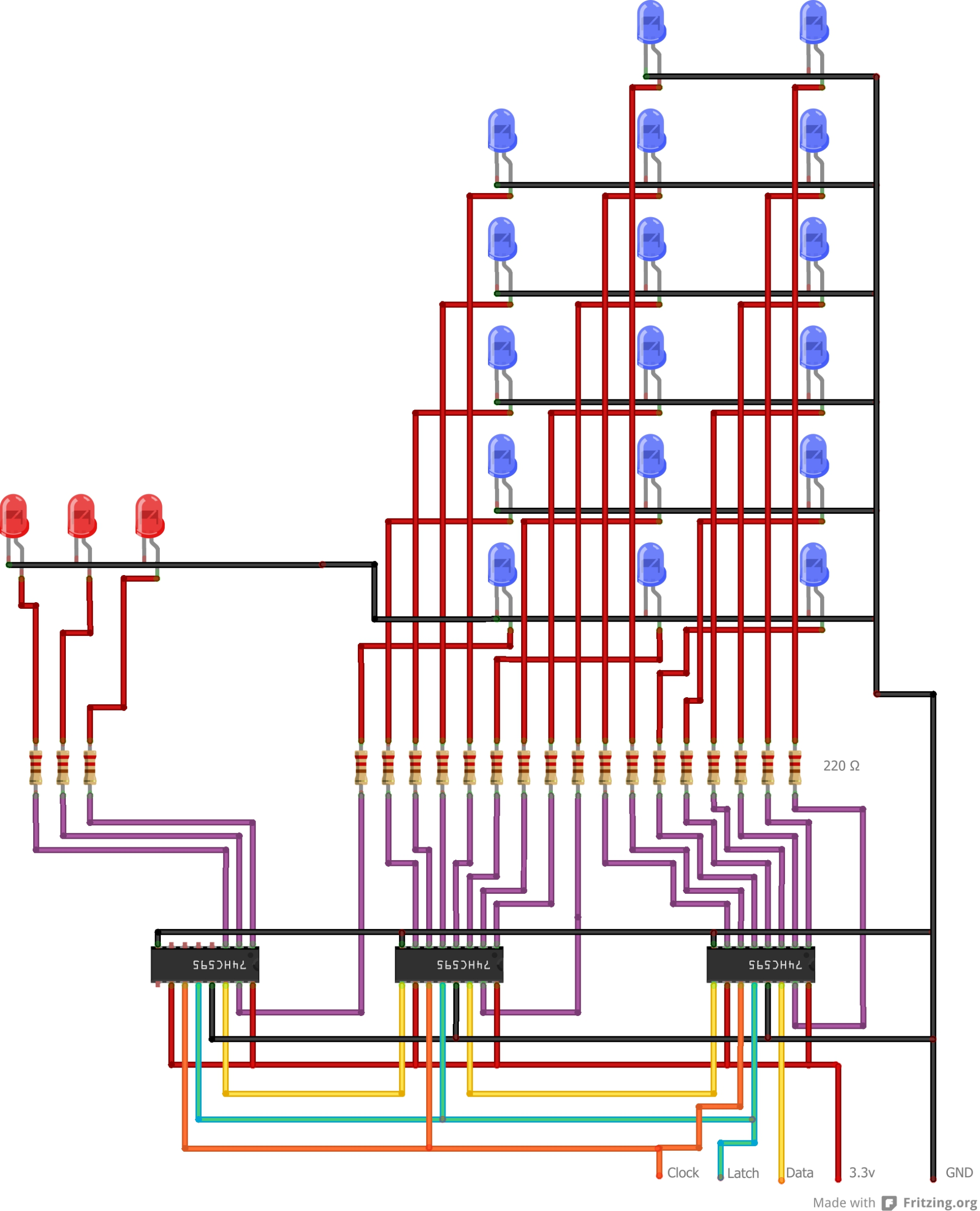 The clock and latch is therefore connected to each shift-register using the same circuit, hence for our 17 LEDs we end-up with the following circuit (click to open the image):