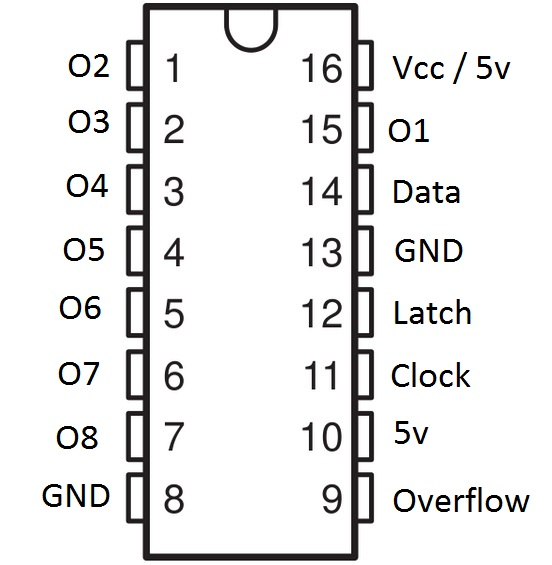 When we want to control more than eight pins, i.e. multiple shift-registers in-series, we simply repeat step 2 (setting which pins to be on/off) sixteen times. However each shift-register in-series is connected like a chain; every shift-register after the first has its data-pin connected to the previous shift-register’s overflow pin (refer to pin-layout). Therefore when the first eight pins have been set on the primary shift-register, the data signal is pushed to the overflow pin - which goes to the data-pin of the next/second shift-register; this continues until the latch is set back to high at the end.