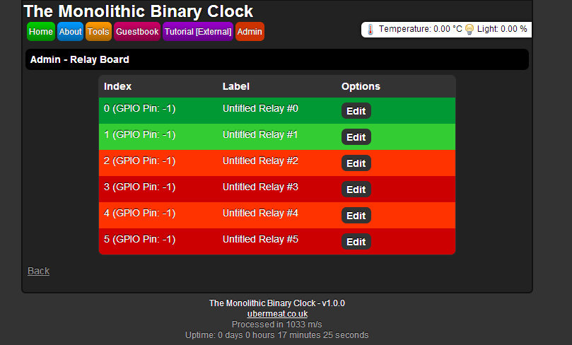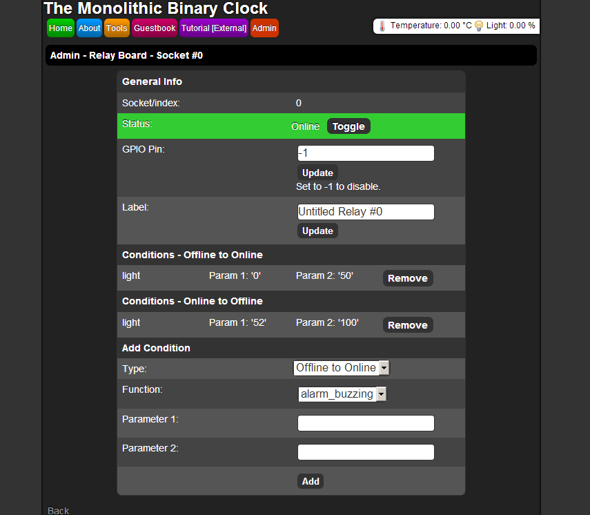 Binary clock GPIO menu, allowing conditions to turn actual power sockets on/off