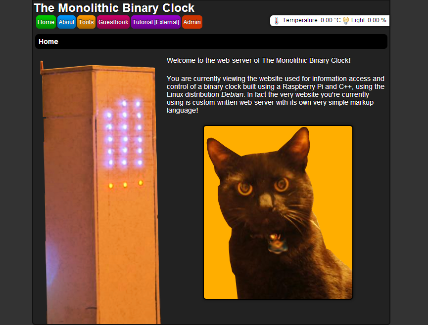 The purpose of this project was to experiment with the Raspberry Pi, electronics and C++; I also wanted to create a new binary-clock with internet-updated time, the ability to set multiple alarms by using a web-browser (alarm clock), a multi-threaded custom-written web-server and room automation based on sensor data.