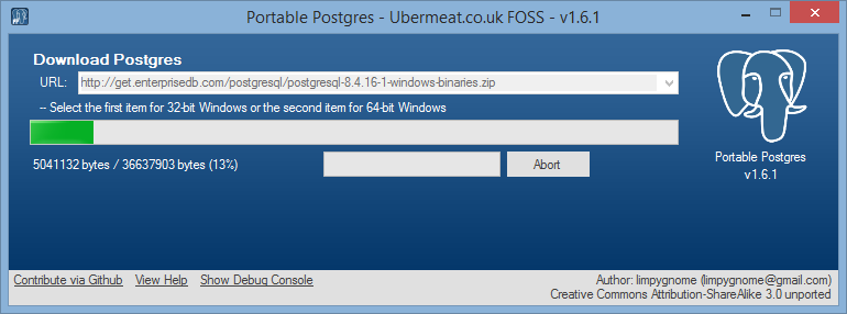 The latest binary can be found at: https://public.limpygnome.com/software/portable_postgres